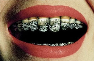 - Manchas en los dientes: Los dientes tienden a mancharse por la acción de la nicotina y el alquitrán. El tabaco sobre los dientes produce una coloración superficial (pardo amarronado) y favorece la aparición de sarro.
